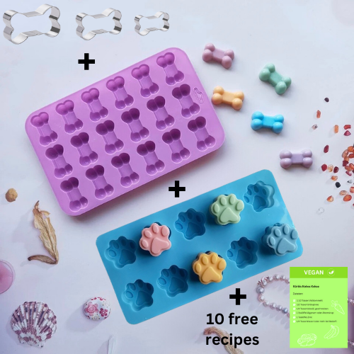 Enter our Homemade DIY Dog Treat Kit, a solution that not only addresses these concerns but elevates the treat-making experience. This kit includes two premium, non-toxic silicone baking molds, three cookie cutters in various sizes, and a collection of 10 diverse recipes to create treats your loyal companion will savor.